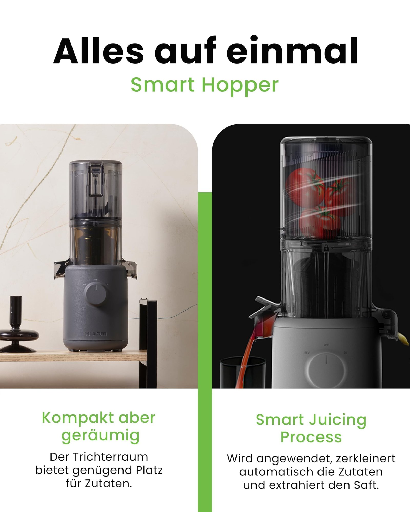 • LANGSAME EXTRAKTIONSTECHNOLOGIE: Der Slowjuicer von Hurom nutzt Slow-Squeezing-Technologie für sanfte Saftgewinnung. Diese Methode bewahrt die Farben, Aromen und Nährstoffe von Obst und Gemüse – ein echter Cold Press Juicer.