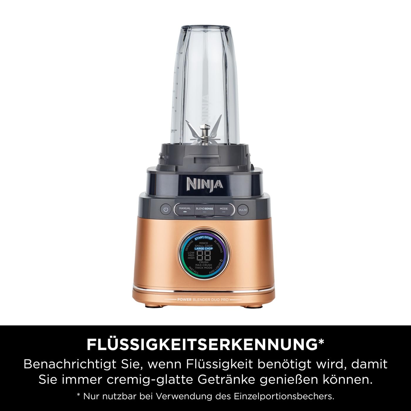 - AMAZON EXKLUSIV: Schwarzer & Kupfer Ninja 2-in-1 Detect Power Mixer Pro & Single Serve. Erkennt die Zutaten, die Portionsgröße und das Eis und passt dann automatisch die Geschwindigkeit, die Zeit und den Puls für ein perfektes Ergebnis an