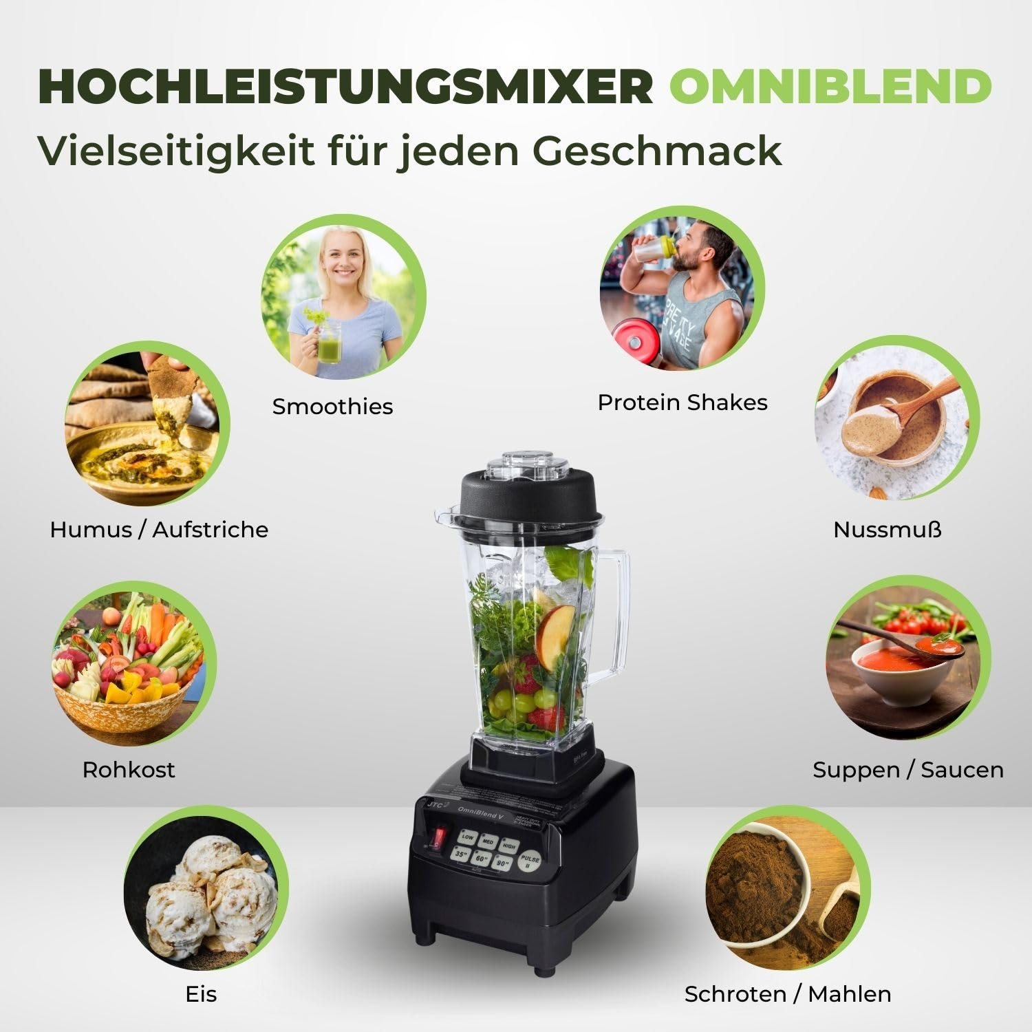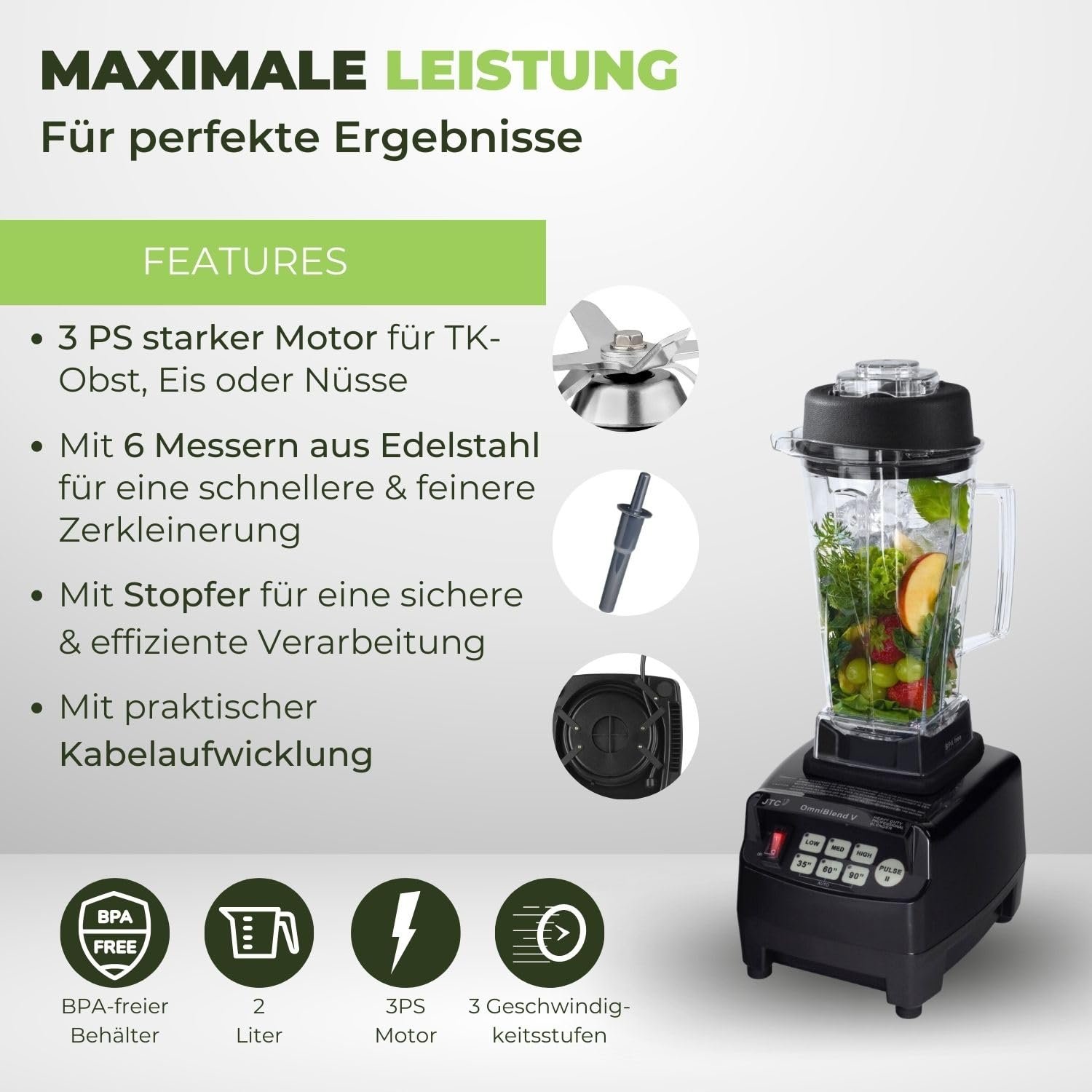 - LEISTUNGSSTARKER SMOOTHIEMAKER – Dank dem 3 PS Motor, 6 Messer-System aus Edelstahl & bruchsicheren, BPA-freien Behälter aus Tritan garantiert der OmniBlend Stand Mixer beste Ergebnisse & eine einfache Bedienung.